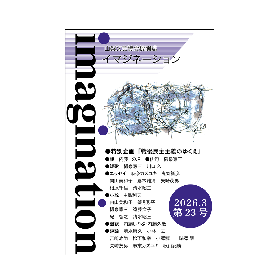 『イマジネーション第23号』 投稿日 2026年3月24日2026年3月25日 書籍情報 『イマジネーション第23号』 山梨文芸協会機関紙。 今号の特別企画は「戦後民主主義のゆくえ」。 宮崎忠尚氏は、「日本の進むべき道—石橋湛山と松下幸之助に学ぶ—」を投稿。日本の民主主義は後退してしまうのか、会員の論考が注目される。そのほか、小説やエッセイ、論考など多彩な作品が並ぶ。